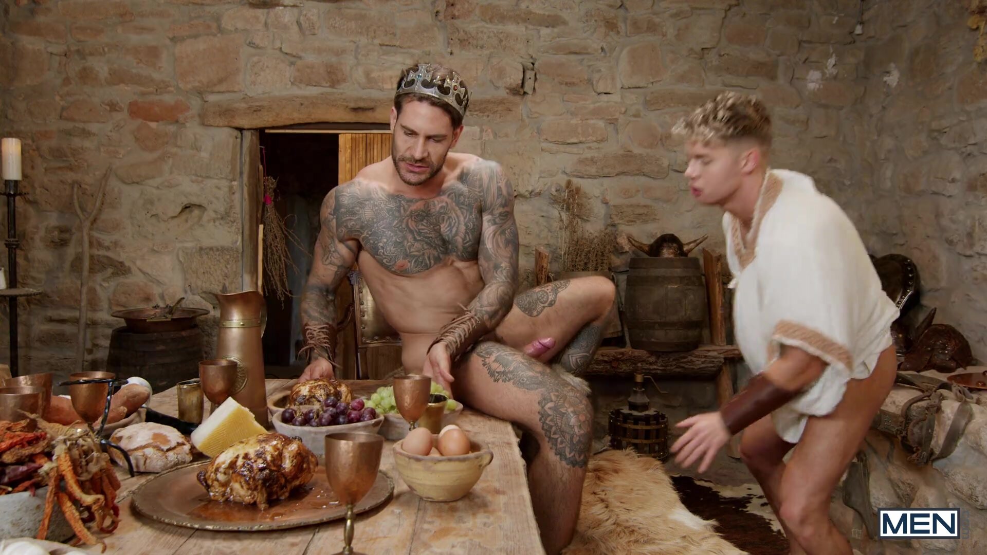 King of the Norsemen Papi Kocic thinks it's just another day, feasting with his fiercest warriors, servant twink Dean Young sitting on his lap and refilling his goblet... until spy Sir Peter delivers terrible news: Dracock the Dragon is approaching, and the god Loki will do nothing but feed on the chaos and destruction. The god himself appears, and the king begs him to find Thor, god of thunder, to save them, as under the table Dean helps himself to a taste of the royal cock. When Loki leaves on his quest, Papi rims the twink and spanks his ass before pounding the bottom doggystyle. Dean worships the king's muscles, sucking his chest and licking his armpit and abs, then rides the monarch before muscular Papi picks him up for a stand and carry. Dean cums as Papi fucks him on the table before bending over and taking the top's hot load on his hole.
