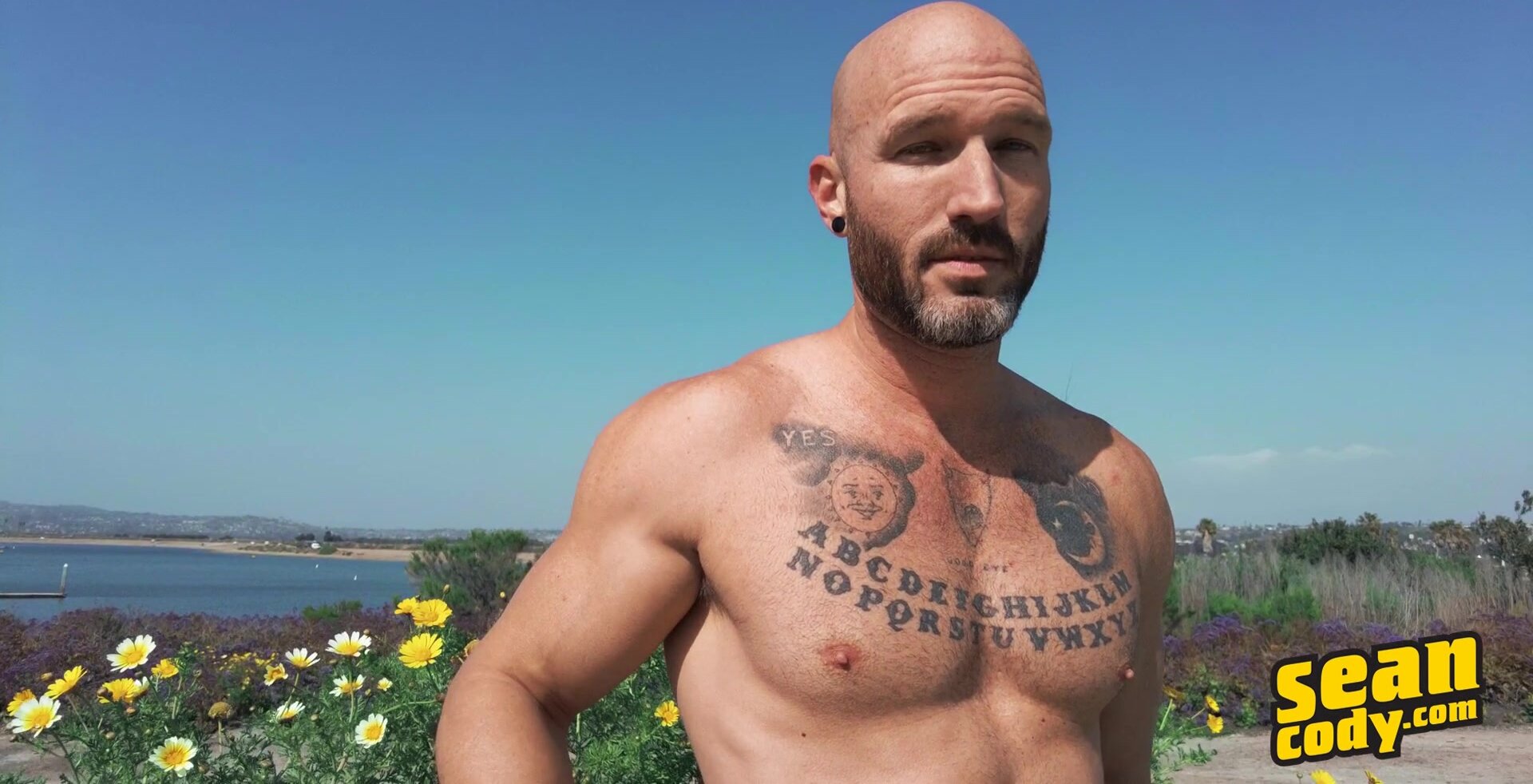 Shaven-haired, muscular Vin hits the beach, jogging along the boardwalk and riding his scooter down the road. This bearded, inked hunk likes to get playful as he rubs his bare chest, plucking a blossom and tucking it behind his ear. When Vin returns to the studio, he shows his sensual side, caressing himself all over as he unzips his hoody and lets his hands play over his muscled chest and abs. Even during his solo, Vin loves to dirty talk through the action, and when he pulls down his shorts to let his massive, hard cock out, things really heat up. Vin spits on his hardon and strokes it, describing just how he wants to fuck, till he shoots a load all over his abs and rubs it in.