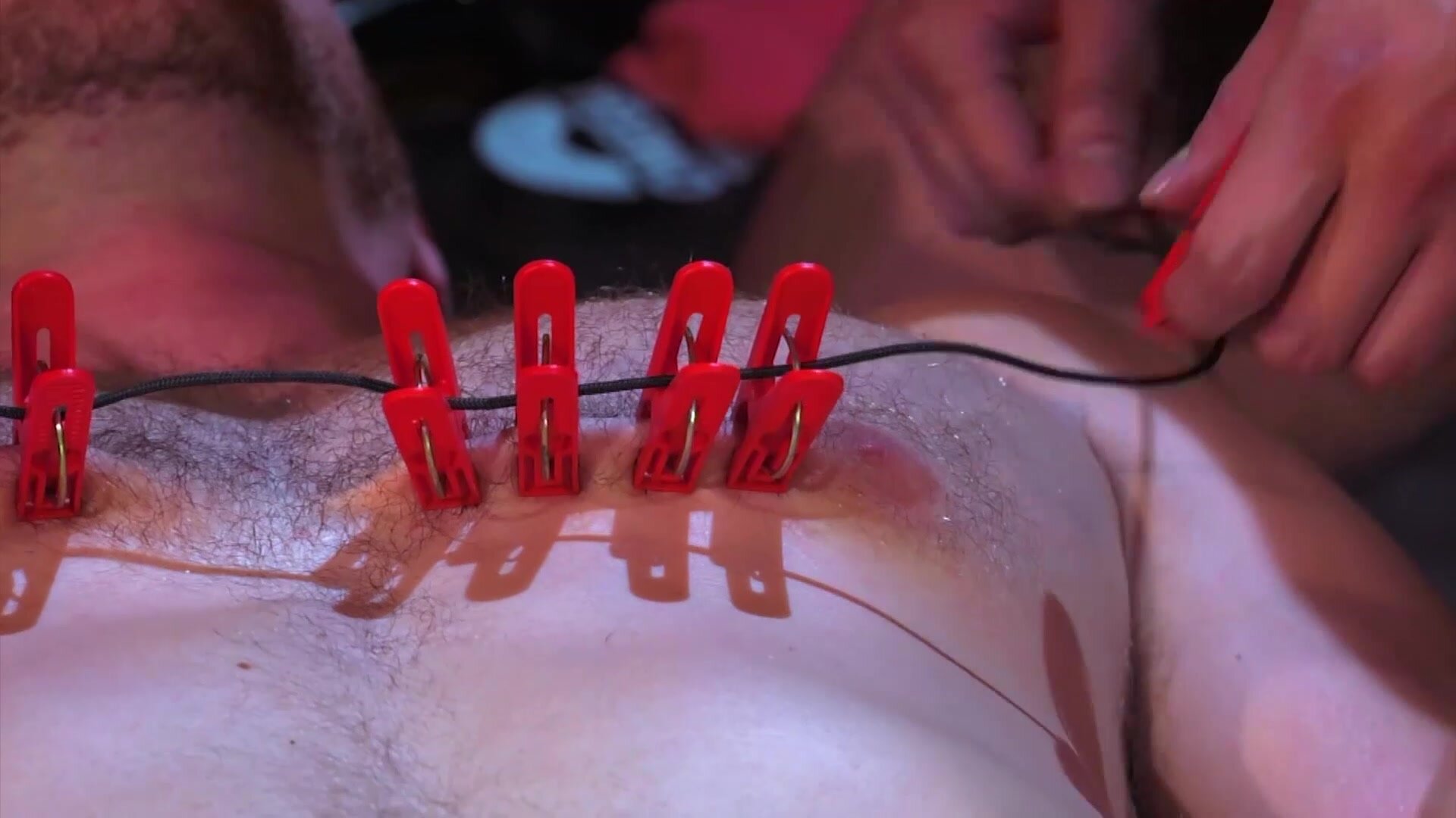 Brian Bonds crouches on a pile of giant tires in the Bondage Garage and enjoys a deep rim job from Eli Lewis. Wearing only a white jockstrap, Eli eagerly services Brian's hairy hole with his tongue. Brian has provided a Magic Wand, which Eli inserts fully into Brian's ass. As Brian enjoys the intense anal stimulation from the vibrator, Eli services Brian's huge, hard cock. Tying Brian's leg's back with leather straps, Eli manipulates the Magic Wand to give Brian the most intense prostate massage. Next, Eli creates a clothespin zipper across Brian's chest, down his torso, and encircling his ballsack. Eli grabs a massive black sex toy and teases Brian's mouth with it. Removing the Magic Wand, Eli reapplies lube to Brian's hole and inserts the toy. Brian's ass swallows the toy to an incredible depth. Eli removes the clothespins on Brian's balls, revealing red indentations where the teeth bit into Brian as sensitive skin. The combination of pain and pleasure sends Brian over the top, and he blows a massive load across his rippling abs.