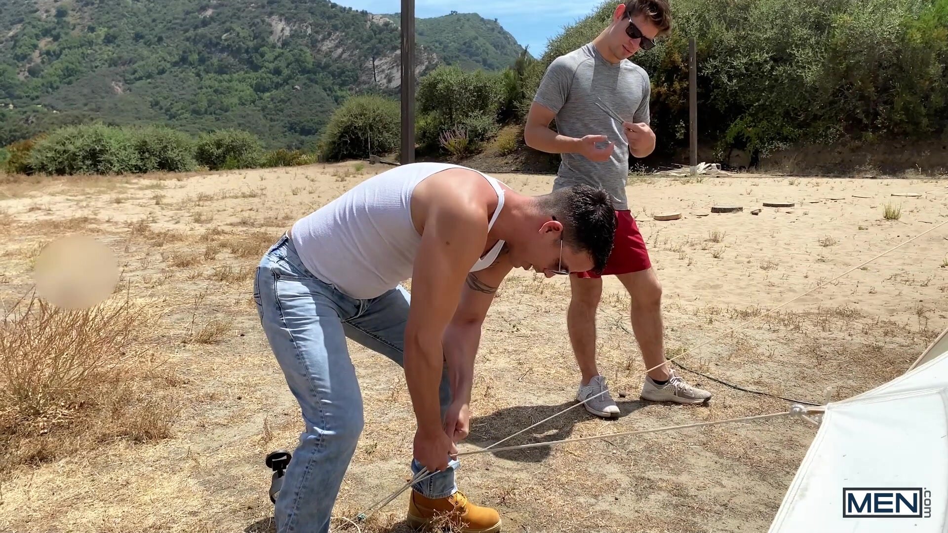 After Michael Del Ray and Nic Sahara pitch their tent at their campsite, Nic crawls inside for a rest, but Michael is pitching a tent of his own in his shorts. He sneaks inside and rubs his cock over the sexy bottom's booty, getting Nic all hot and bothered. Michael goes outside to take a leak in nature and catches Nic jacking his pole when he returns, so he sticks his wood through the tent flap for Nic to suck. Nic swallows the top's erection and Michael comes inside so he can return the favor before telling Nic to sit on his rod. As Michael fucks his ass mish, Nic rubs his wood like he's trying to start a campfire till he cums, and the top pulls out and blows a big load on his hole!