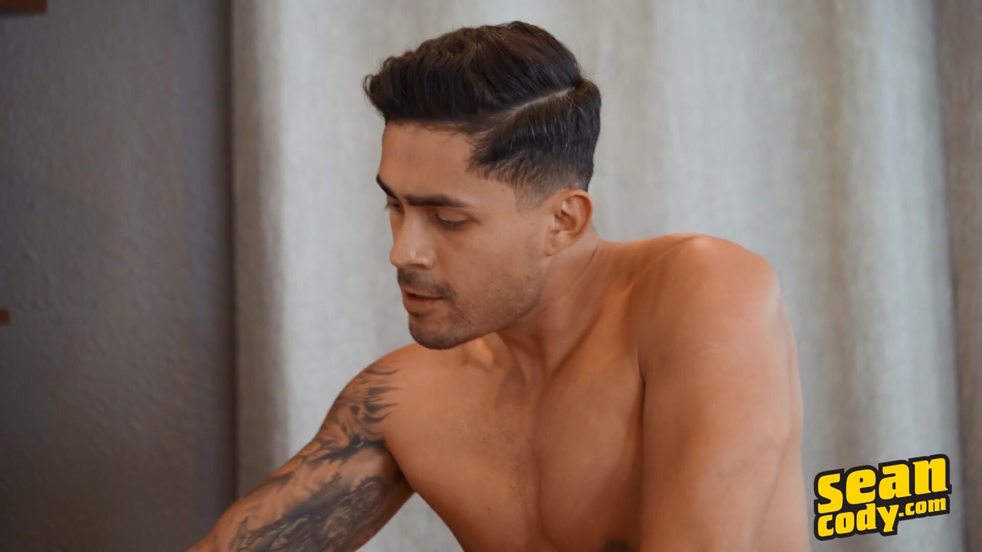 Brayden is eager to show how happy he is to be back on set as he kisses Asher all over, trailing his mouth down Asher's muscular chest and abs to lick and suck his bulge. Asher pulls out his cock and Brayden swallows it, then the top bends Brayden over, rimming and fingering his hole. "Oh yeah, I wanna be inside of you," Asher says, and Brayden tells him to get right to it! Asher fucks the bottom doggystyle, pulling his hair, and Brayden moans, "Holy fuck, you're really drilling my hole!" Brayden can't believe how big Asher's dick is as he rides it, and the top kisses Brayden's foot as he fucks him missionary before lying Brayden upside-down to pound that ass piledriver and shooting a big load all over it! Asher licks up his cum and tongue-fucks the bottom's hole as Brayden jacks himself off till he cums.