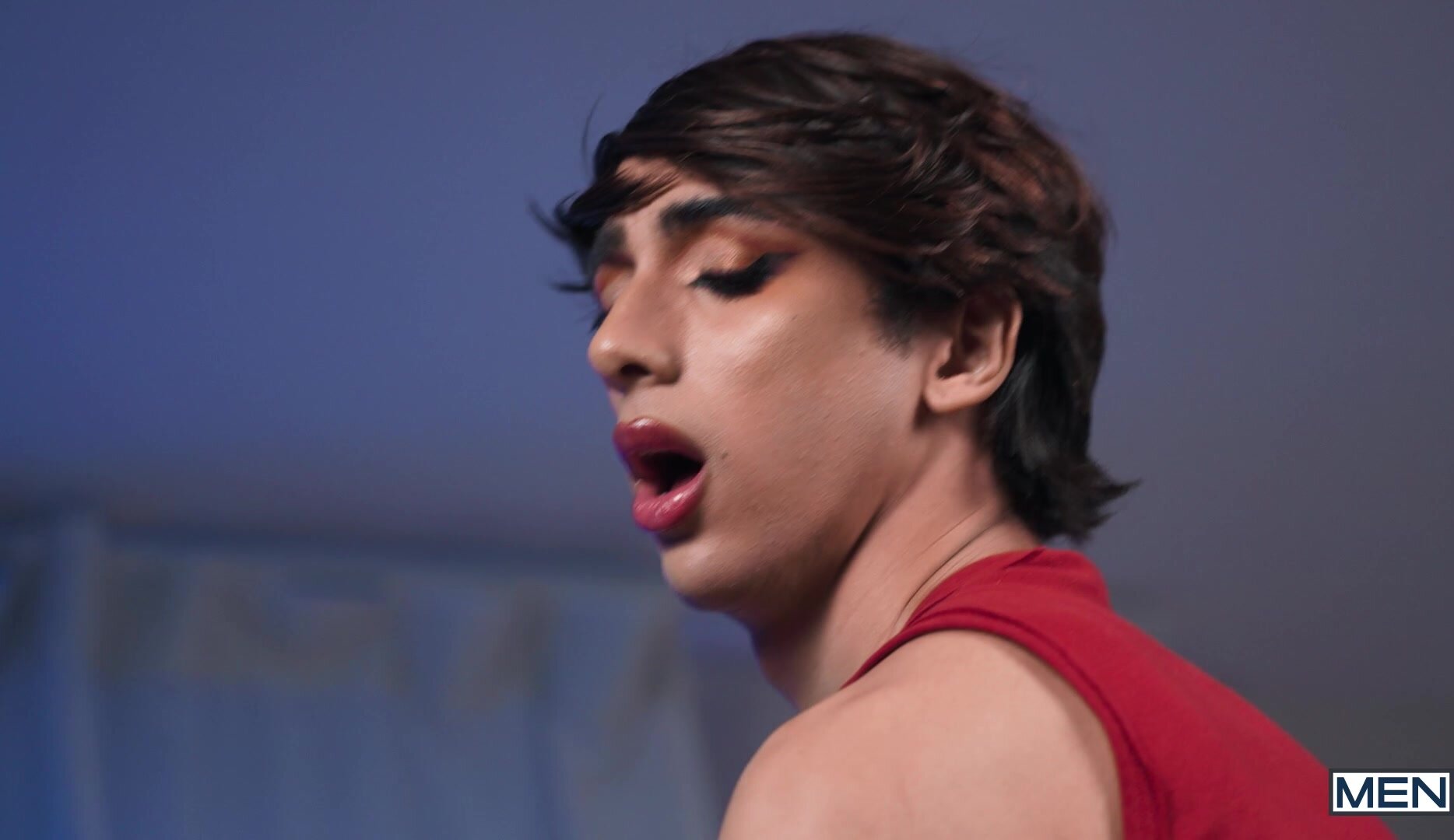 Femboy Foxy Alex keeps setting off the metal detector at airport security. Security agent Dom King does a bag check and wands him before finally finding the cause: Foxy's cock cage! He brings the femboy to a private room for a cavity search, spitting on his hole and sliding his fingers inside. Foxy doesn't have a key to the cage, so Dom picks the lock before Foxy deepthroats him. The agent fucks the femboy doggystyle, then Foxy rides him before Dom hoists him for a stand-and-carry. Foxy cums hard as Dom pounds him on the table, then begs for the top's load on his face.
