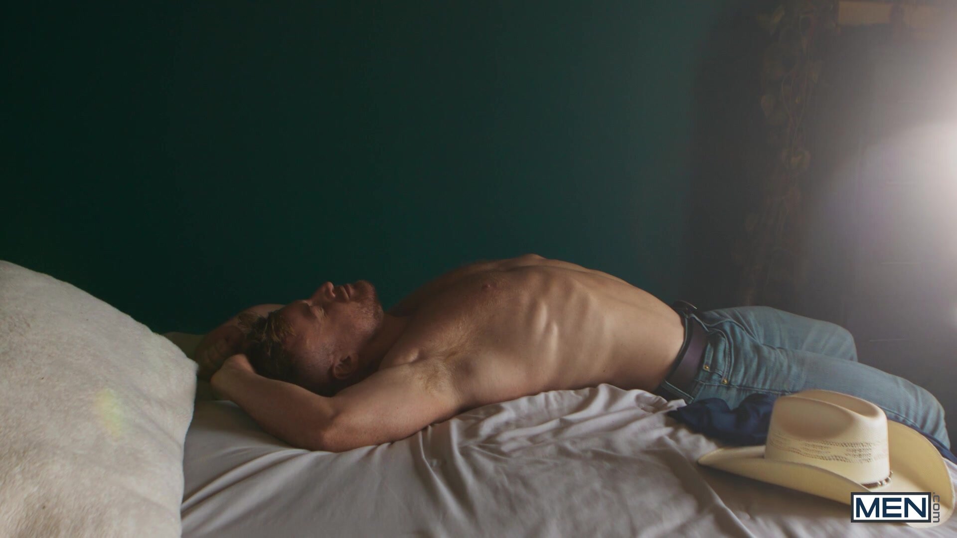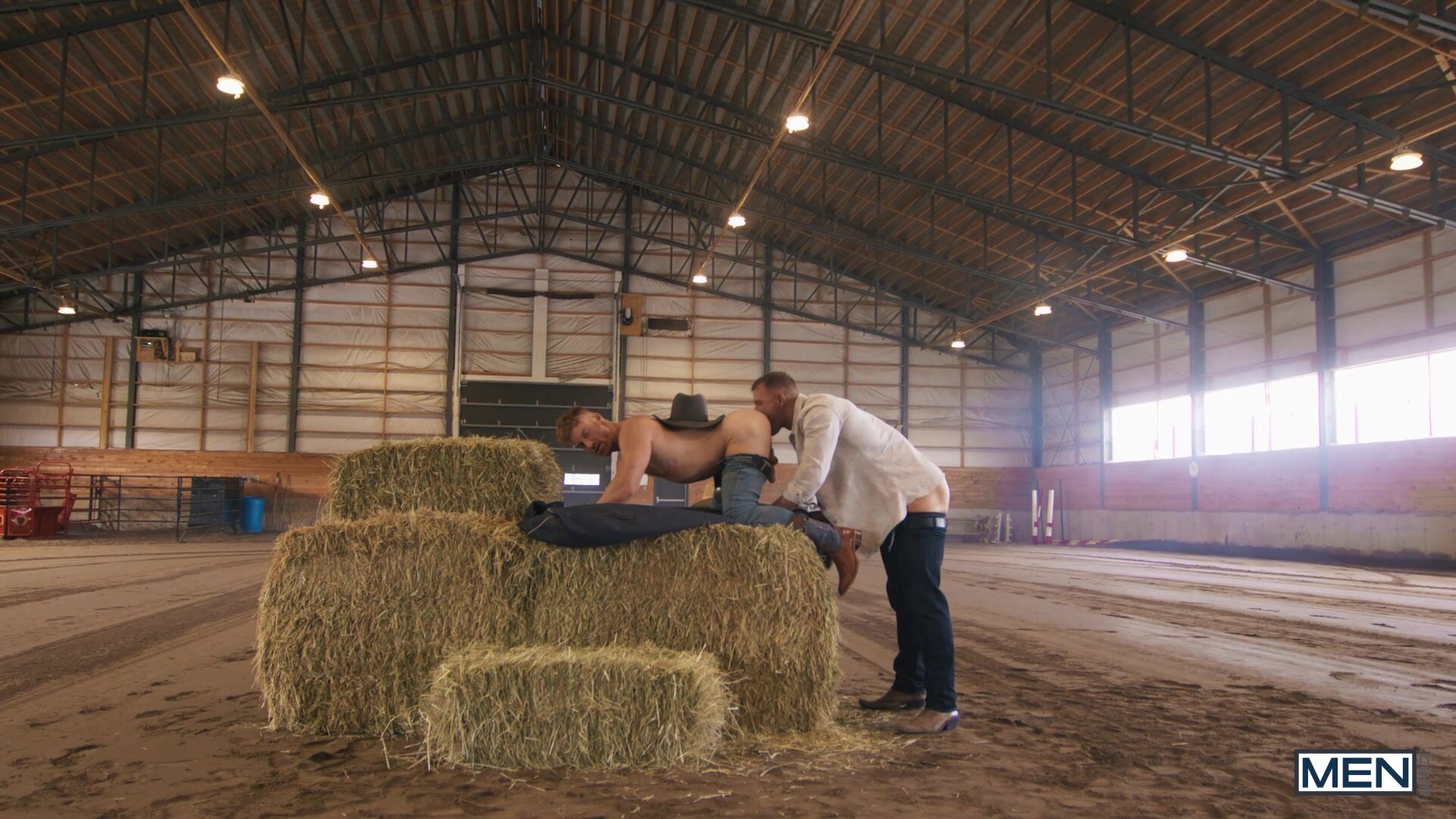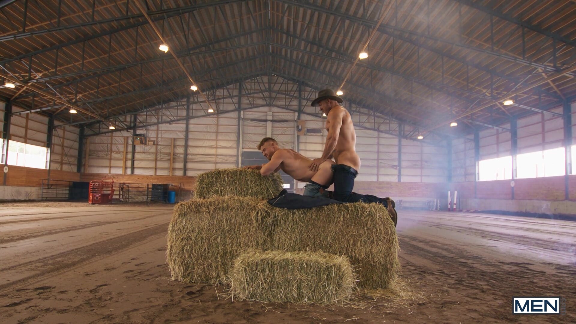 Tim James hasn't quite readjusted to country life, lying in his bed till noon and earning a scolding from his mom. The new neighbors, Angelica and Austin Wolf, are visiting, and Tim can't believe when the handsome cowboy touches his bulge under the table, then takes out his cock behind the women's backs! The guys take a ride out to the barn where they have a heart-to-heart about fucking men in the country, and Austin pulls Tim close for a kiss. Tim sucks the top, then gets rimmed before Austin pounds him from behind. He fucks Tim on his back on some straw bales, then the bottom eagerly rides his big dick till he cums, and Austin gives him a facial.
