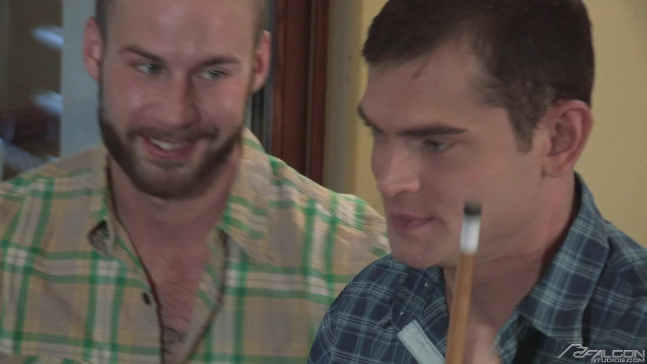 Chris Bines' game of pool is enhanced by by his crack, which peeks out above his waistband every time he bends over to shoot. While Luke Milan decides which balls to target on his next turn, Kaleb Klark walks in, a towel around his waist. He's probably on his way to the hot tub, but Chris grabs the towel and yanks. Kaleb is caught between fright and flight, frozen in his tracks as his family jewels become the cue and balls of Chris and Luke's ongoing game. Chris calls him a 'nice little dish.' Kaleb is young and sexy, with smooth, pale skin and thighs made to squeeze you. Putting their mouths together, Luke and Chris quickly bring him to erection and to gushing orgasm. Kaleb continues to wherever he was headed, while Chris and Luke, fully aroused now themselves, suck and fuck up a storm. Chris reveals what lies beneath that enticing crack, and Luke impales it. Then, Chris flips Luke onto his back and returns the fuck. Luke clamps onto his balls and huge gobs of spunk jet out of his cock. A few more thrusts, and Chris pours a load onto Luke's abs.