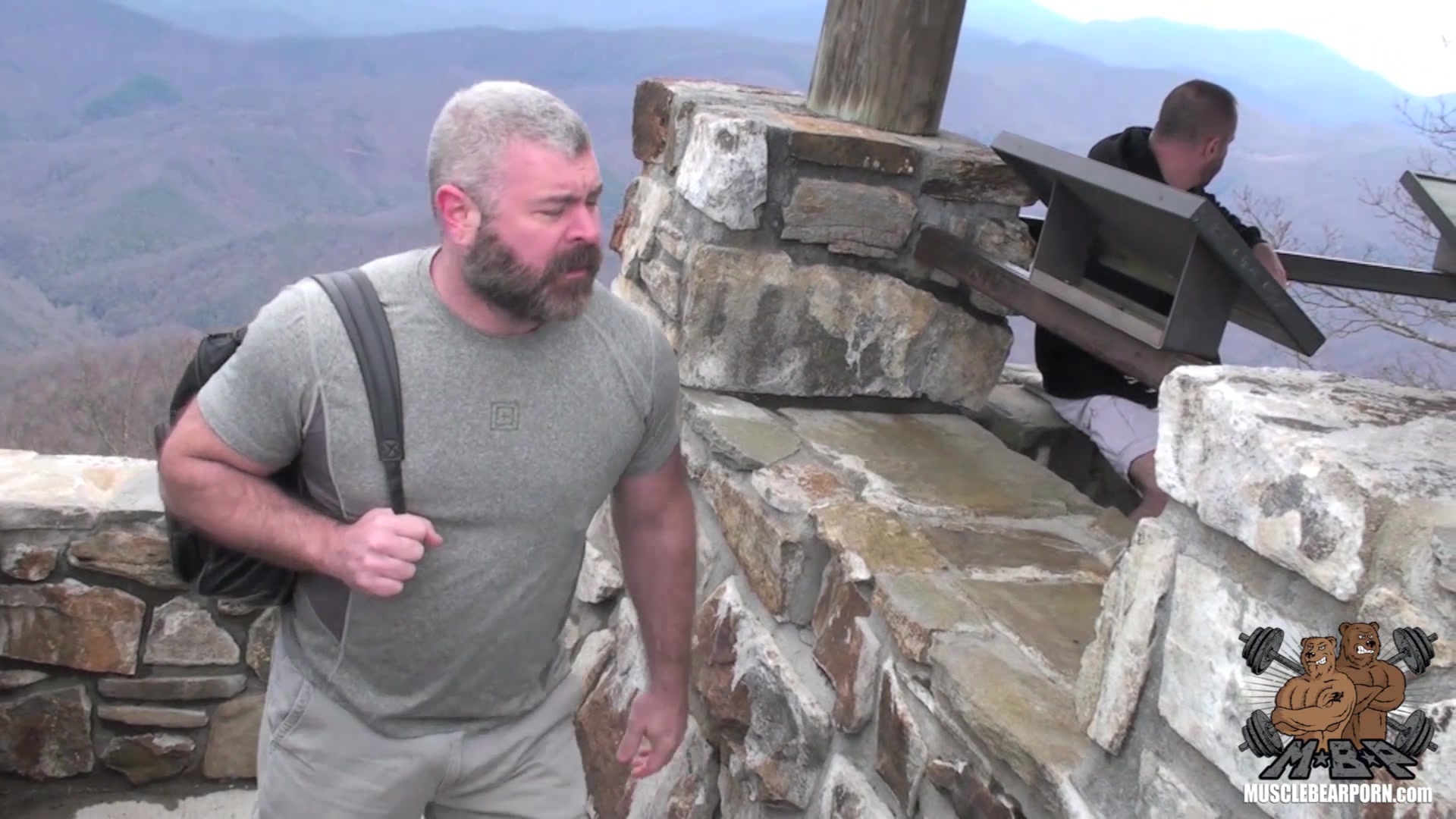 Daddy Will and Liam have been hiking the Appalachian Trail. On top of a 5,400 peak, they meet up in a stone fire tower overlooking TN, SC and NC. The two get it on while other hikers approach. Thick muscles, great chests, big arms, and Liam's hungry hot ass. Will loves fucking Liam's hole and there is great footage of his thick cock stretching Liam's hole til he pumps a load up inside.