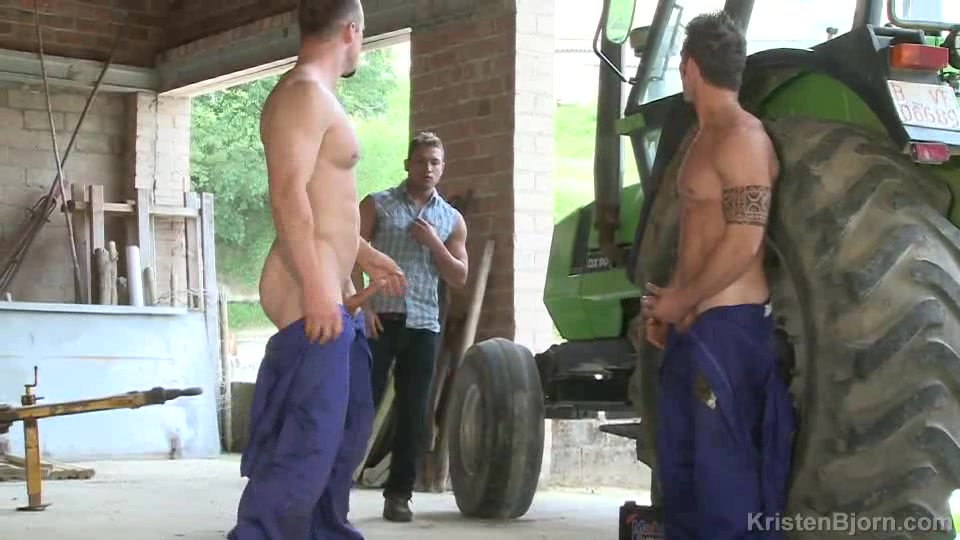 First Time Part 1 Chapter 3 - Your first 3-way is a big step in your sexual evolution. Rado is a mechanic working on a broken down tractor when Mattias comes in and offers a helping hand. Of course that hand wanders to everything but the tractor. The mechanics are soon removing each other’s uniforms to reveal their perfectly sculpted muscular bodies and rock hard cocks. Mattias goes down on Rado first and Rado quickly picks up the tempo and begins fucking Mattias’ face. Valentino admits he is no angel, but there is one thing he has not yet experienced. He stumbles across our two mechanics and decides it is time to learn to suck two cocks at the same time. Although he has never done this before, you have to give him credit for the great effort he puts into it. Our mechanics then treat Valentino to another first, having his cock sucked and his ass eaten at the same time. The sensation of being pleasured from both sides of his body drives him mad with desire. Our mechanics now treat Valentino to another first, being in the middle. Valentino takes Mattias from behind while Rado takes Valentino from behind. Valentino never knew such an amazing sensation could exist, fucking and being fucked at the same time was just so incredible to him. Finding his rhythm in the middle takes a little time, but once he has it there is no turning back. Who knew your cock and ass could be pleasured so perfectly at the exact same time. Mattias is not missing one beat of this action and is soon delivering his hot load as Valentino and Rado continue the fucking. Valentino loves the sensation of Mattias’ ass milking his cock while his ass is being pounded and releases his load onto Mattias’ thighs. Rado is the next to erupt his huge load that his heavy swinging balls had been building up. A 3-way can be the hottest experience of your life, as long as you know where to line up in the train.