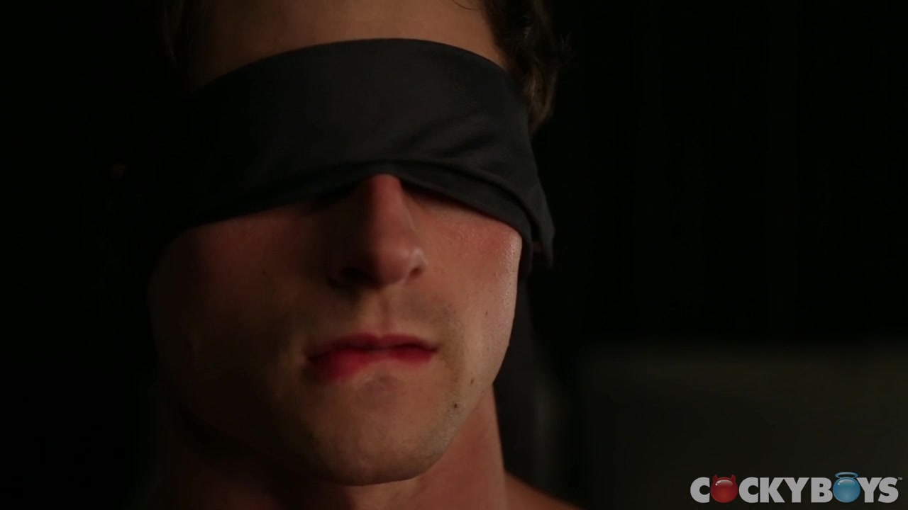 Taylor can feel Josh's foreskin sliding across his shoulder and soon he gets his first taste of cock. Josh progressively gives him more, and a taste of underwear, before he thrusts in giving Taylor most of his thick cock as he holds him by the hair and blindfold. Pleased with the service, Josh gives him a passionate kiss and plays with more of Taylor's half-exposed cock and, without saying a word Taylor's mouth begs for more cock. Instead Josh unties Taylor from the chair and re-ties his wrists over his head in the doorway. Here Josh strips off Tyler's jock, rims him and bites his muscular ass cheek before he teases his crack with the feel of his hard cock.