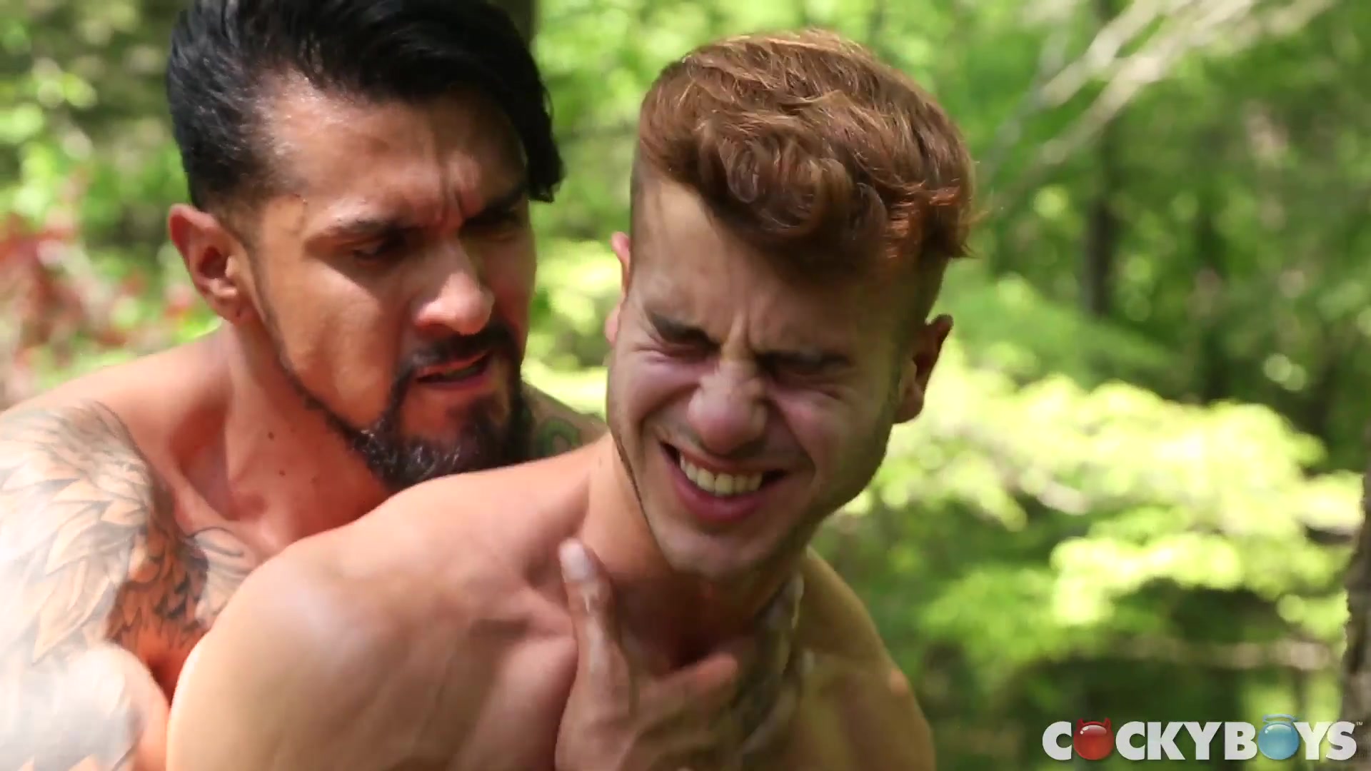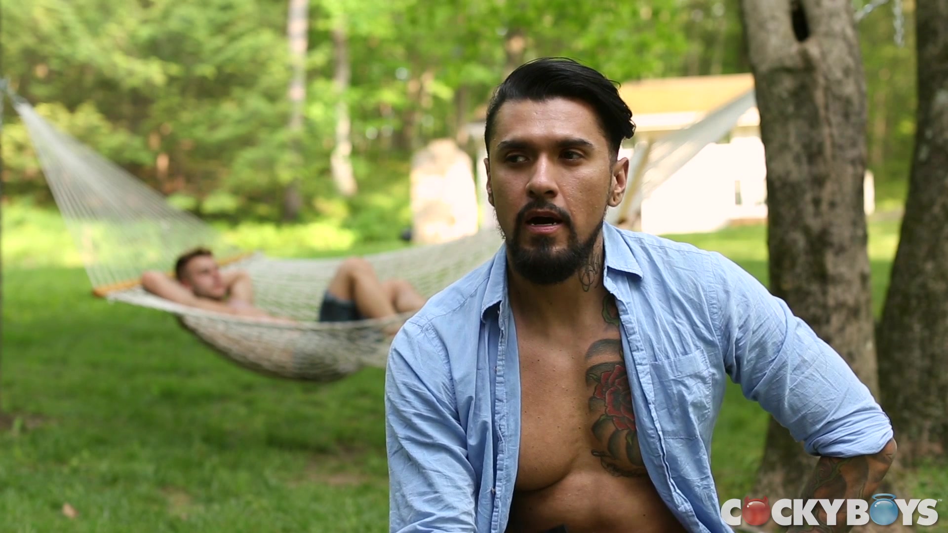 Description: “I hope that Boomer will fuck me very hard and will destroy my ass. I love that and I want it!” That’s the first thing Allen King says about Boomer Banks and you can see the twinkle in his eye… He means every word of it. As Boomer and Allen lay on the hammock surrounded by the beautiful scenery they can’t help but feel attracted to each other. As Allen says - “He’s a power top, I’m a power bottom” Do we have to say anything more? Before anyone has a panic attack - yes, we are aware of the fact that Boomer’s cock is practically half the size of Allen but to be fair - Allen is the one who asked for it. Of course, here at Cockyboys, we’ve learned our lesson already - never deny a hungry power bottom a monster cock. It’s actually against the law and Allen is here to prove to all of us that when there’s a will, there’s a way! As he begins to suck on Boomer’s 10 incher it becomes obvious that Allen has been waiting for this moment for a long time. He does not even show any sign of struggle as he devours the humongous cock down his throat. But what Boomer really wants is to “cuddle-fuck” the hell out of Allen so he grabs him in his arms and slowly puts all 10 inches inside Allen’s tight hole from the back. Once they start going there is no stopping these two. They literally fuck like rabbits all over the place - on the hammock, on the trees, on the fence… No place is off limits and no position is too much as long as Boomer keeps plowing Allen hard and deep. At one point Allen even says he can’t take it anymore but he doesn’t want him to stop. If that’s not the definition of a true power bottom then I don’t know what is! Finally Allen can’t hold it anymore and while Boomer is drilling him on the fence he shoots his load all over his chest which Boomer does too right after that.