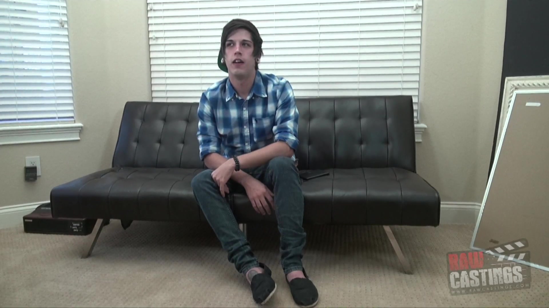 The casting director has Kyler on the couch today for a raw casting. Kyler is 23 years old, and he has a bit of an emo look going. His straight black hair underneath a backwards cap, gauges, and his outfit indicate that he is an alternative type of guy. Kyler professes to be bi, but he doesn't have a lot of experience getting fucked. Once a guy with a 9 incher tried to fuck him, and Kyler didn't like it much. Kyler, though, needs the money, so he wants this porn job badly. His waiter job just isn't cutting it. When asked about what he likes sexually, he says that a mutual experience is the best - where both guys are verse and equally aroused and satisfied. The director gets Kyler out of his clothing as he snaps some photos. Kyler has some tats, but not too many. His body is average, but his butt looks fuckable. Kyler doesn't mind being nude, but he insists on keeping his cap on, saying that it is "his signature look." Once Kyler is stroking it on the couch, he reveals a nice thick cock. The casting guy doesn't want to waste any time, so he pulls out his cock, too. Kyler is down on it sucking away before you can blink. The guy definitely likes dick! He doesn't have a gag reflex, and he makes a lot of noise while giving a blowjob, which is good. After getting some grade A head from Kyler, the director sticks it bare into this newbie's hole. Once Kyler is on his back, you can see that he has a hairy / otter thing almost going on. As the director's dick slides in and out, Kyler moans sensually and jerks himself off. While he can take a fucking with ease, he doesn't seem to have much pizzazz. Nonetheless, his hole must feel great because the casting director doesn't let up. He fucks and fucks away, even giving Kyler some light face slaps to test out his tolerance to being treated like a bitch. That does the trick, because shortly thereafter, Kyler asks for it harder and busts a nut while he is getting barebacked deep. The casting guy cums immediately thereafter, cumming all over Kyler's ass. Bareback Casting Complete!