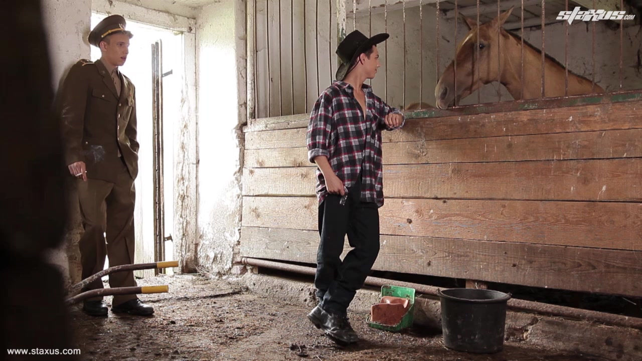 Army officer, Sven Laarson, gets a proper milking from horny farmhand, Хander Hollis! 2013 There’s a belief in some quarters that country boys are somehow naive and not adept at the ways of the world, but that sure as fuck doesn’t come across here when farmhand, Xander Hollis, encounters army officer, Sven Laarson, in the stables. The reality is that the young dark-headed lad appears to know exactly what he wants from the fellow in uniform, and it’s no time at all before he’s got his dick out and forcing it down Laarson’s throat.