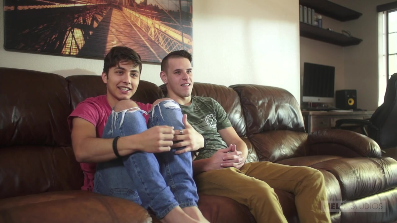 Our porntastic series #Helix is back with a top notch, naughty fuck from our favorite new top and bottom, Shane Cook and Angel Rivera! The guys answer your questions and act out your fantasies directly from the fans on Twitter. The scene starts off with a bang. A request for a passionate kiss breaks the ice for the fantasy couple's first scene together, this makes them comfortable to answer every query in deliciously dirty detail! We find out SO much about our boys this go round, such as how they're liking filming in Vegas and their future dreams to their favorite fuck positions and much more. The questions move to requests and both boys get asked to flex. They flex their biceps and bounce their pecs while stealing sultry glances at each other as the sexual tension builds. Shane tickles Angel's feet by request before they get asked to spank one another's bare bottoms. Of course Angel bends over first and gets his fanny flogged by Shane's strong hand. Cook bends over next and seems super into it, asking Angel to spank harder! Rivera mentions he liked it better when Cook was cracking HIS caboose. Shane takes the bait and gives the kid a few more cracks on the can before they can no longer resist locking lips. From then on it's a fantasy fuck cum to life! A masterful make out goes down while Rivera handles Cook's beer can sized cock and and Shane soothes the Angel's cherry cheeked, freshly spanked backside with soft caresses. Rivera kneels down to worship Cook's super sized uncut cock and receives a side of dirty talk along with his main course of meat. The hot hunk wraps his huge arms around his naughty new partner and lays him down to deliver a delicious dick licking. Shane tosses Rivera's well muscled legs in the air and goes ham on the hottie's hind end, eating, spitting, spreading and fingering the kid's fuck hole. Our strongman scoops up his lusty latin and places him right down on his huge hog, bareback. It takes Angel's tight end a second to accommodate all Shan has to offer, but soon enough the beautiful boy is bouncing for joy as the sweet sound of hard fucking fills the air. Cook orders Rivera onto his knees, remembering doggy style is his favorite position. He piston pounds the kid's caboose to a perfectly pervy pulp. Rivera just enjoys the hard hammering for a long while without wanking, ordering Cook to "get all the way up in there." Finally the fuck is too fantastic and his rager needs some release. He reaches down, telling Cook to keep hittin' that, then blasts the couch with a hot load of fresh cream. Cook cums immediately after and annihilates Rivera's raw rump with blow after blow of boy juice. He crams the colossal cock back up Angel's amazing ass, then lays his cum slicked schlong in the kid's crack as they kiss once more.