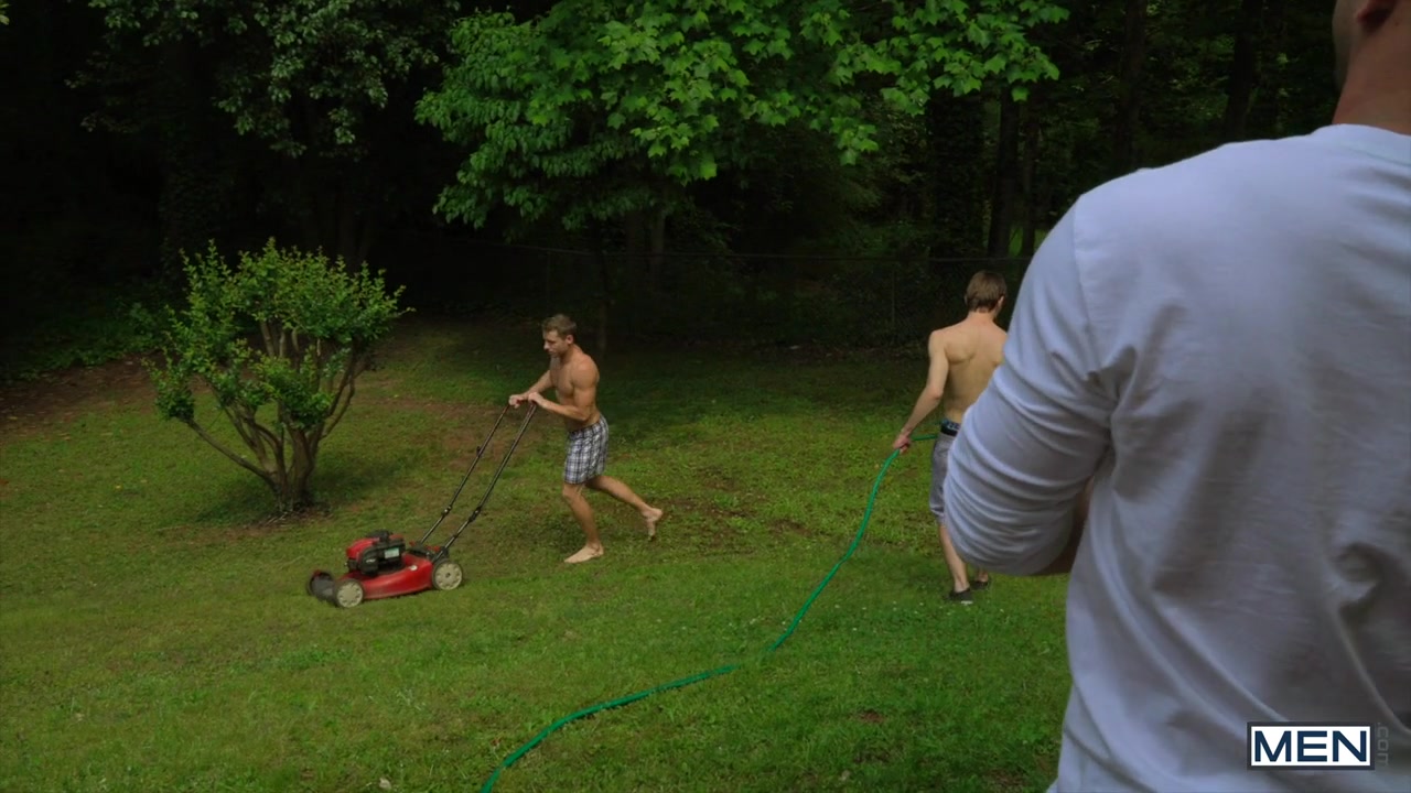 Description: Allen Lucas is watching his new hire, stud muffin Justin Matthews, mow the lawn with his chiseled, bare chest out. The horny hottie recruits his friends to help him pull a prank on Justin so he can get him in the buff. They douse him with water, forcing him to run inside naked, where Allen is conveniently waiting with a towel to help him dry off. Justin is really turned on and accepts a blow job from Allen, priming his dick to fuck some boy pussy for the first time before getting fucked himself!