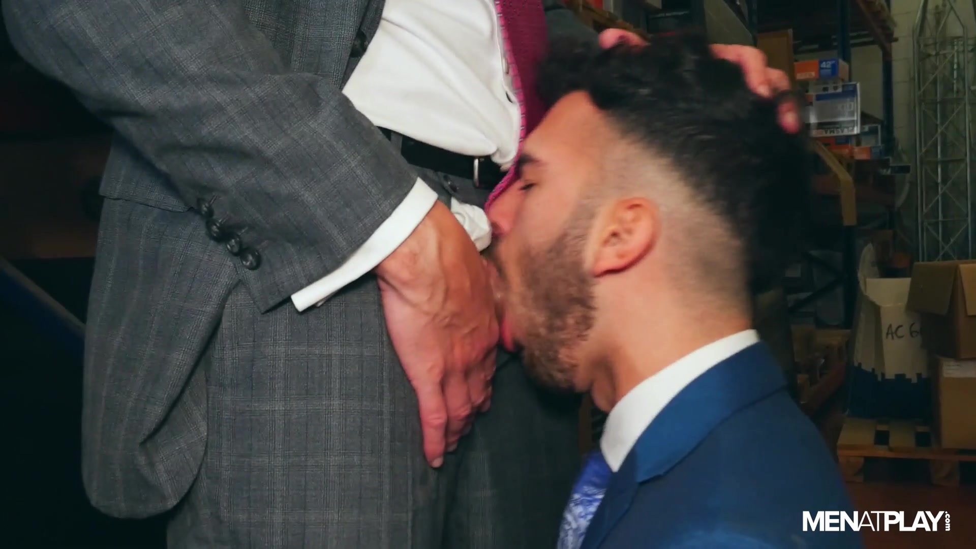 Later, when Leo asks Pol if he’s done -- he gets asked in return "Are You Done?". Pol noticed the boss jerking off earlier and wonders what else Leo does with his new employees. While Leo denies everything - Pol knows and likes what he saw! He likes them big and wants to taste and ride the boss’ thick cock. Leo wants to work less and play more too - the two suited studs flip-flop fuck in the warehouse.