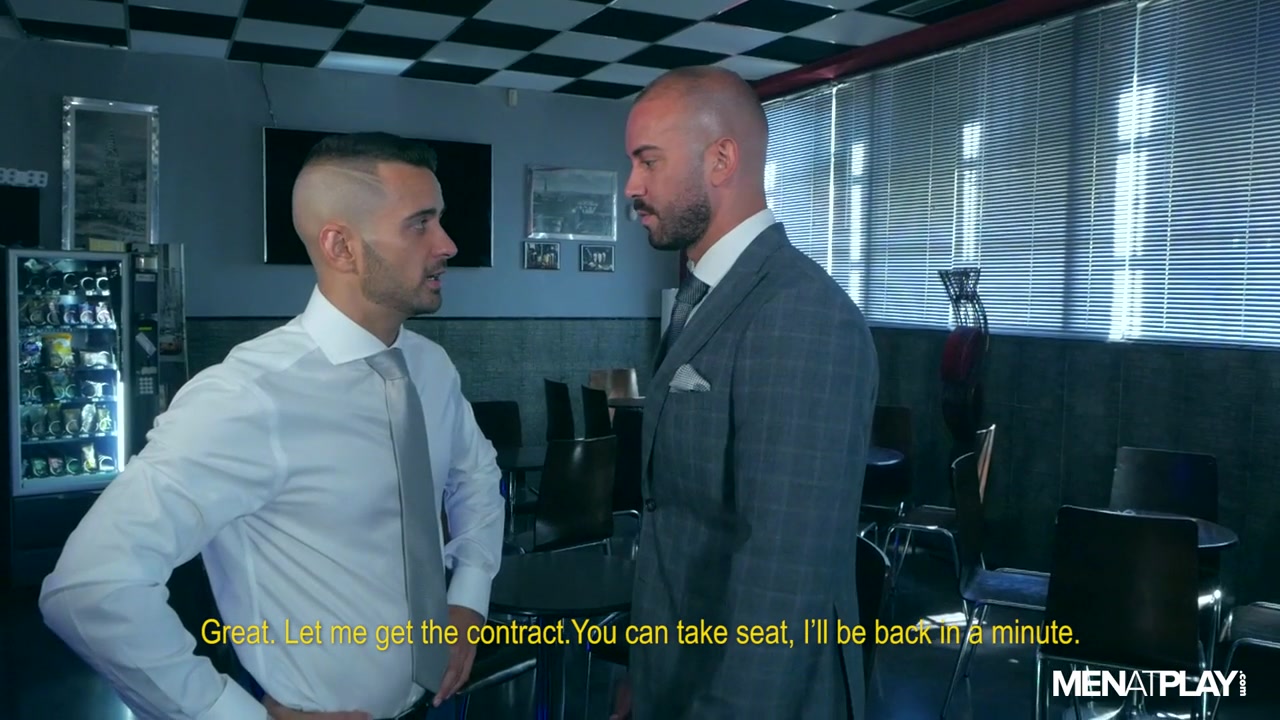 The studly Tyler Berg is all too pleased to find a slutty Dani Robles with his pants down -ass up - and waiting eagerly to be fucked. Tyler notices a note requesting that he wear a condom; after devouring Dani’s hairy ass, Tyler decides he wants to take things to another level, and stretch that hole with his bare cock instead. The two suited hunks waste no time pounding away and savoring every second of an enviable encounter. Suits on, condoms off.