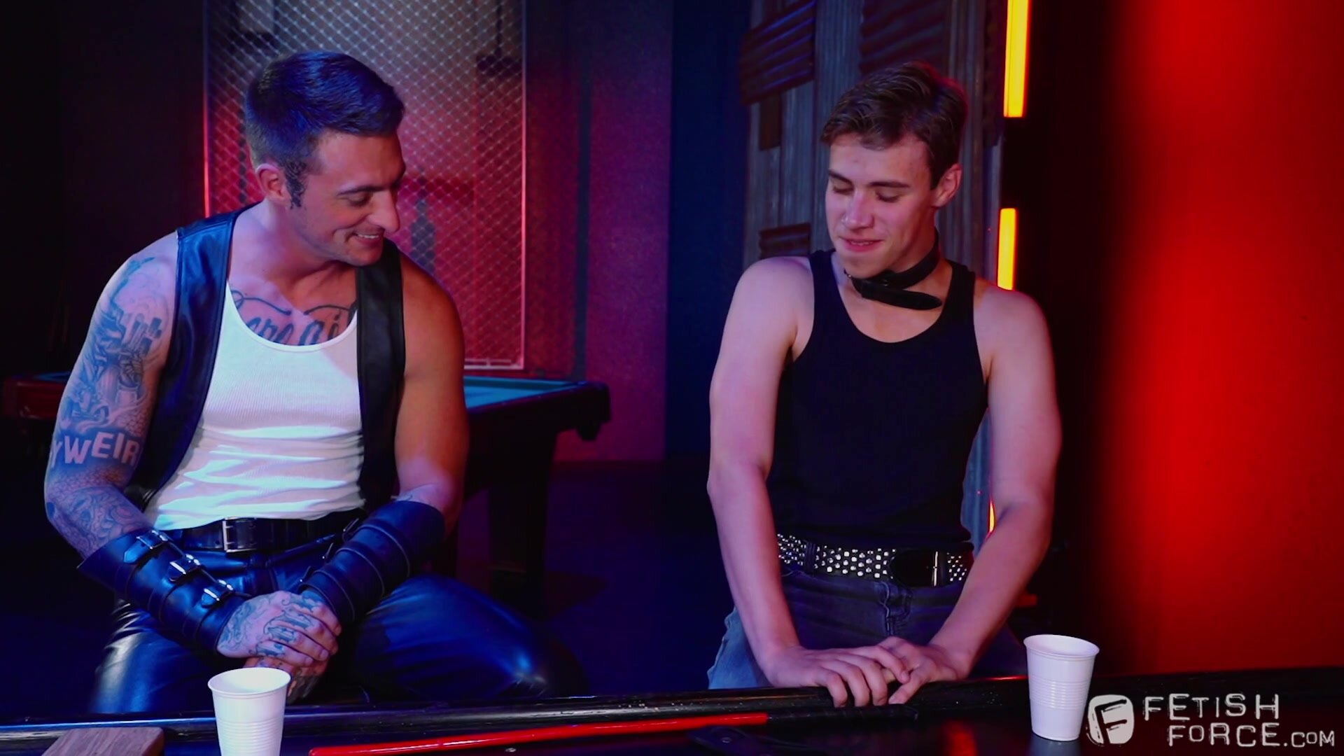 Dane Stewart is distracted from his game of pool when he sees Adam Awbride from across the bar. Dane offers to buy Adam a drink, but he's only 18 so Dane takes his new toy to a private room. Adam is eager to learn some new things and Dane is happy to show him a few tricks. Dane puts a bridle on Adam and gets to work opening his shorts. Adam is in complete ecstasy when Dane reaches in and pulls out Adam's hard dick. He teases the young hunk by jacking him off before he pulls off all of Adam's clothes and bends him over a barrel. Dane pulls out a paddle and gives Adam a nice playful spanking and then gets on his knees to take Adam's dick in his mouth. When Dane senses that Adam is as hard as he can be, he turns Adam back around and slides his big, hard cock deep into Adam's ass. He pumps away, filling Adam's tight hole and stretching him to the limit before rolling Adam over onto his back to take him to the finish. Dane's cock feels amazing going in and out of Adam's hole, which is why he can't hold off any longer. 'Cum for me boy,' Dane demands as he gives Adam permission to blow. With Dane still fucking him, Adam lets go and blasts his load all over himself.