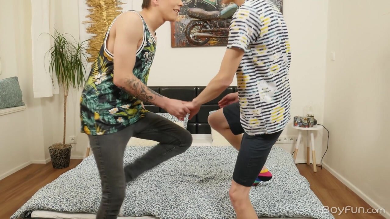 Fit boy Beno Eker is enjoying a smoke break on the balcony when insistent young Nick Danner persuades him to come inside for a little BoyFun. Of course his reluctance is just a game, he's soon giving in and heading to the bedroom with his sexy young friend.