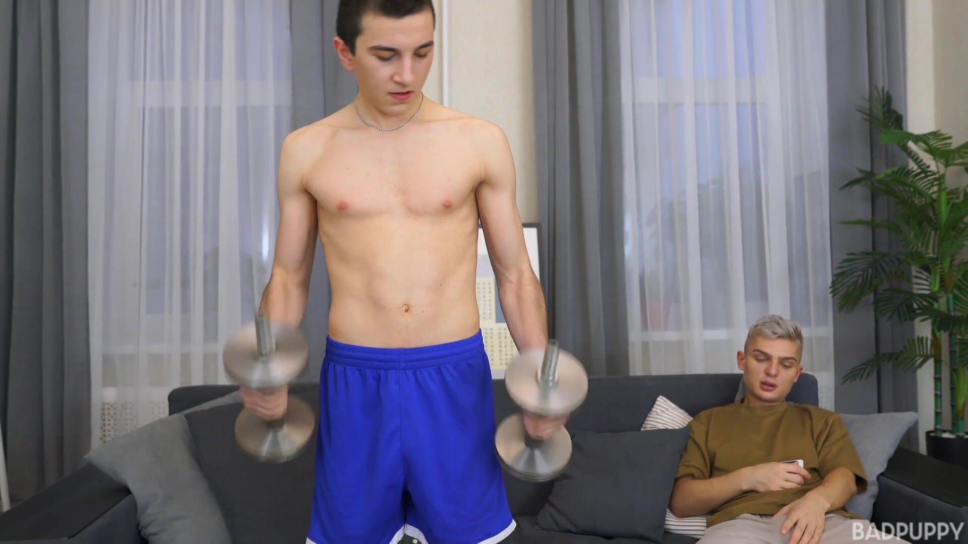 Alpan Stone is trying out a new set of weights when Alex Blade comes in and sits down beside him. Alpan stands, strips off his shirt, picks up the weights and starts working out again. Alex is quite turned on watching Alpan and he starts massaging the hard bulge growing in his shorts. Alpan catches Alex out of the corner of his eye and turns to allow Alex a better view. Alex drops to his knees and pulls off Alpan's shorts and underwear. Aplan's long, thick cock plops out right in front of Alex's face. Amazed with its size Alex woofs it down, huge cock-head and all. While Alex is nursing on Alpan's dick, Alpan massages Alex's butt cheeks. Alex want's Alpan's cock up his ass very badly. He lays back on the sofa and Alpan helps him out of his underwear. Alex pulls his legs back offering his tight, pink hole to Alpan. Alpan buries his face and tongue deep in Alex's hole, loosening and priming it. He kneels behind Alex and slowly pushes his thick cock deep inside. Alex grabs onto his own cock and starts stroking in rhythm with Alpan's motion. Alpan works Alex's hole all over the sofa until Alpan feels he's about to blow. He pulls out and dumps a thick creamy load of cum coating Alex tight abs. Alex's can't hold back as he starts squirting load after load of jizz all over himself. Completely satisfied the two enjoy a kiss before the camera fades to black.