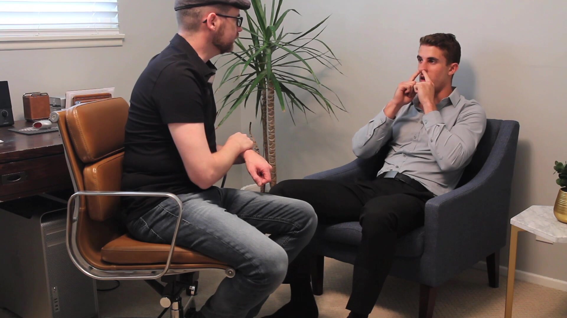 Dr. Smith thanks Darren for coming and explains that this video is going on his website to advertise his hypnotherapy business. Dr. Smith states he just wants to use Darren as a demo patient and states most of his clients are people looking to work on fitness and diet. Darren agrees to try and jokes even he needs to work on his diet and then states his only rule is no nudity or anything sexual. Dr. Smith states he was thinking of having Darren be shirtless or maybe even naked to attract more views as Darren states he rather keep his clothes on. Dr. Smith asks if he’d be willing to act like he was hypnotized and maybe do some silly things like act like a chicken and Darren again states he doesn’t want to do anything humiliating and states he was told all he had to do on the phone was pretend to be asleep. Dr. Smith pulls out his pendulum as he begins counting from 5 to 1 Darren continues watching and as Dr. Smith hits 1 falls into trance. Dr. Smith walks over to Darren to see if he’s actually hypnotized or just acting and moves his head which lifeless falls back down to his chest and even picks up his arms and drops them. He then wonders aloud if this is just acting and asks Darren if he’s awake and gets no answer. He then tells Darren when he wakes up he will believe they haven’t started yet and begin picking his nose and not realize he’s doing it.
